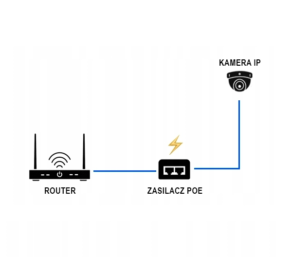 Schemat podłączenia kamery do internetu oraz zasilania poprzez zasilacz PoE.